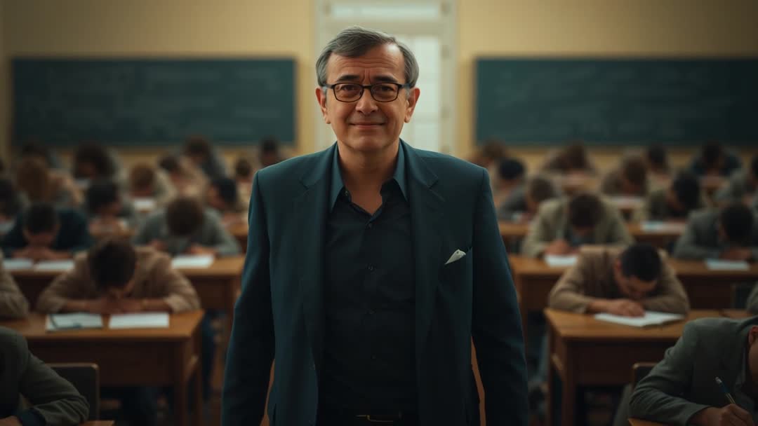 AI Generated Image. Video showing senior male proctor walking slowly down classroom aisle while monitoring students taking written exam. Proctor wearing dark suit and glasses, carrying lapel microphone, moving through rows of wooden desks. Students leaning over papers, focusing and writing, background chalkboards adding academic tone. Cinematic shallow depth of field keeping proctor sharp while students remaining softly blurred. Warm muted color palette creating calm vigilant mood. Usage ideas: training videos for invigilators, educational articles about exam security and academic integrity, promotional content for testing centers and tutoring services, stock footage for documentaries about education, website hero for university or school landing pages, corporate e-learning modules on classroom management. Licensing suggestion: ideal for editorial and commercial projects needing classroom supervision visuals.