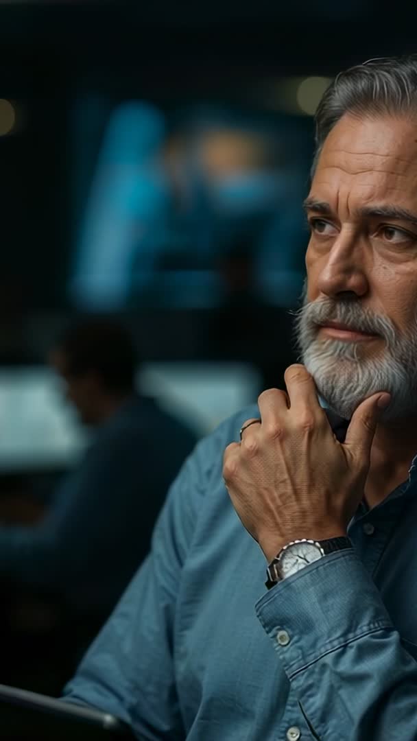 AI Generated Image. Featuring close-up of thoughtful senior professional scanning monitors in dimly lit operations center, conveying focus, experience, and high-stakes responsibility. Visual composition offering strong copy space on left for headlines, lower thirds, or animated graphics. Working well for tech, cybersecurity, incident response, control room operations, and executive decision-making storytelling across corporate videos, news segments, and training modules. Serving well for vertical social media ads, webinar intros, hero reels, or website banners targeting IT services, security vendors, emergency management, and leadership communications. Color grading and shallow depth of field creating cinematic, authoritative mood. Frame working vertically for mobile-first distribution and easy repurposing for short-format content.