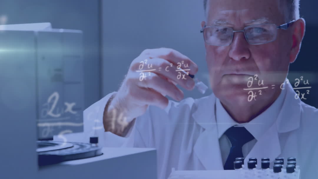 Senior scientist in laboratory wears glasses while engaging in an experiment. Mathematical equations are visible in the scene, representing complex data analysis and scientific research. This video useful for depicting advanced scientific studies, technological innovation, STEM education, or biotech company profiles.