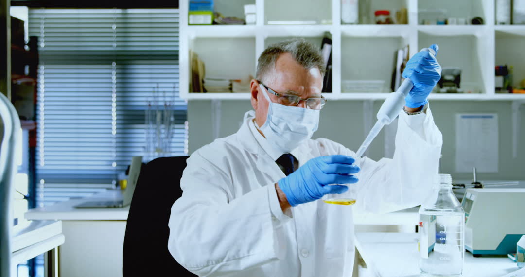 Senior male scientist wearing protective gear is seen carefully using a pipette to analyze a liquid sample in a high-tech laboratory environment. This video can be used to represent scientific research, laboratory work, innovation, or technological advancements in biomedical and chemical fields. Suitable for use in articles, educational materials, and presentations about science, research methodologies, and laboratory practices.