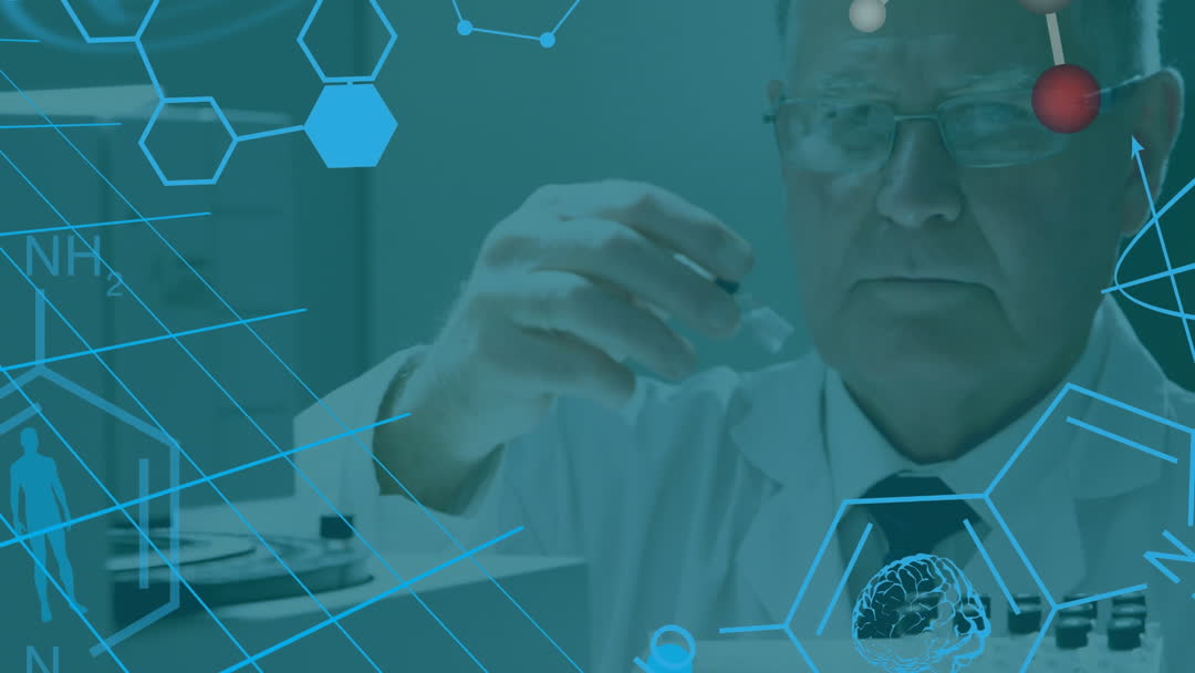 Senior Scientist Conducting Laboratory Research with Scientific Overlay Video