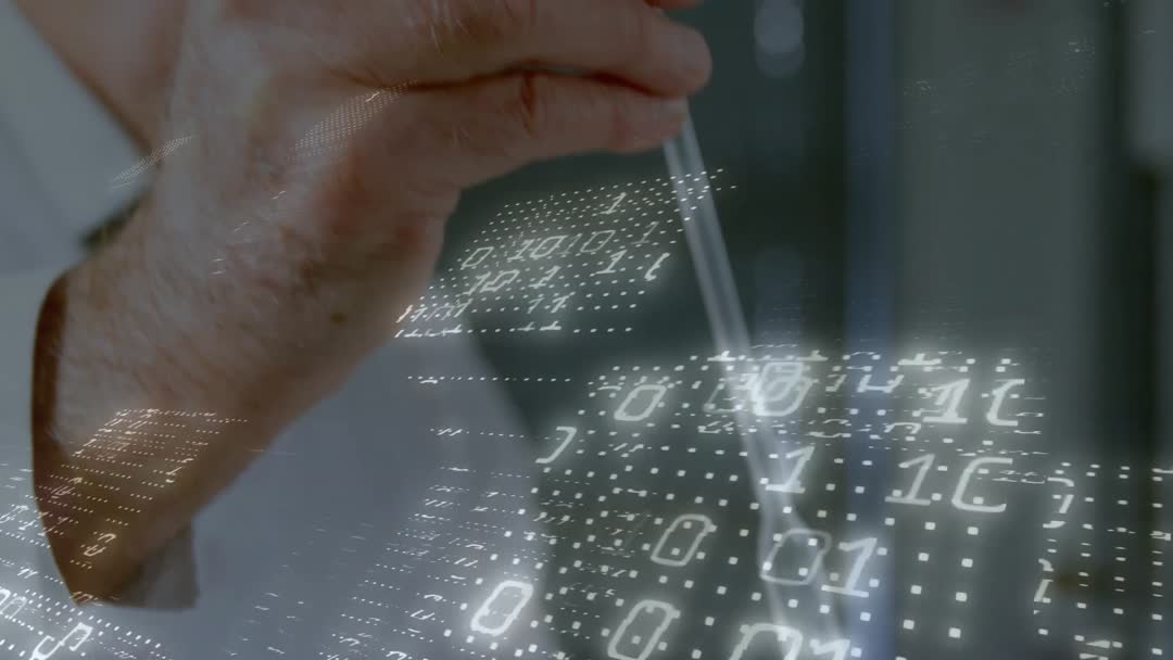 This visual depicts a senior scientist in a laboratory carefully adjusting a pipette to draw a red fluid. The scene is enhanced with a digital binary grid overlay, symbolizing advanced technological involvement in scientific research. Ideal for illustrating themes of modern innovation, precision in experimentation, and the integration of technology in scientific settings. Suitable for content about scientific research advancements, lab technologies, and biotech industry promotion.