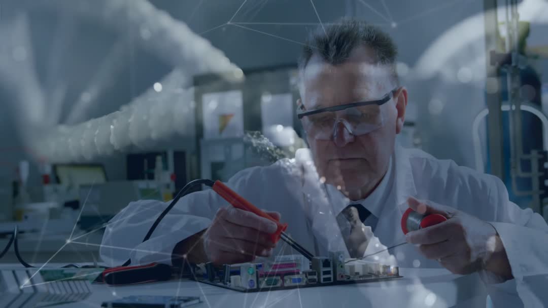 A senior scientist is carefully testing a circuit board in a laboratory, symbolizing the fusion of traditional scientific research and innovative technology. Digital visuals such as helixes and data points enrich the surrounding, providing a conceptual feel of advanced scientific computation and data analysis. Perfect for use in articles, presentations, or marketing material about innovation in technology, modern scientific methods, or the future of research development.
