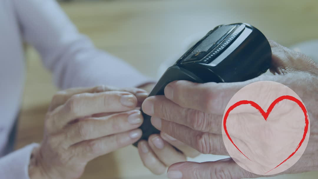Image features older icon making contactless payment via smartphone, focusing on the adoption of modern digital technologies among seniors. The overlayed red heart highlights health and security themes. Ideal for use in articles or advertisements about technology adaptation, contactless tech benefits, or fintech products for senior citizens.
