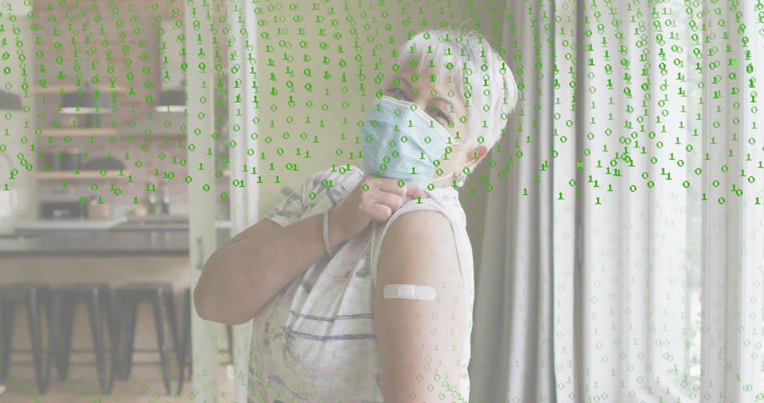 This scene depicts a senior woman standing by a window with a facemask, showing a small bandage on her upper arm symbolizing a recent vaccination. The numbers overlay gives a modern, tech-driven feel to the concept of health and healthcare advancements. This visual suggests themes of confidence, medical progress, and societal safety measures, making it ideal for use in healthcare promotional materials, articles on vaccinations, or tech-health blog posts.