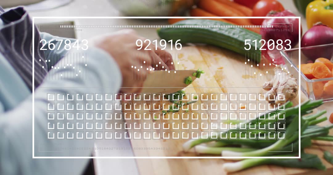 Senior woman chopping scallions while smart HUD overlay displaying live counters and grid Video