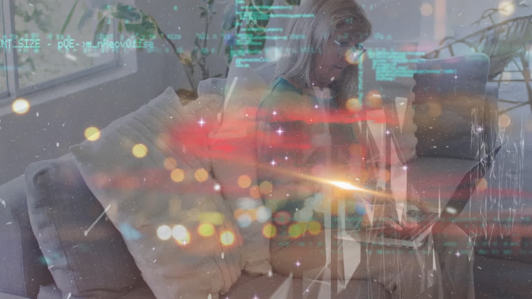A senior caucasian woman using a laptop with digital data and lights overlay. Perfect for illustrating modern technology, coding, or remote work settings for older adults. Ideal for content related to innovation across generations, online learning platforms, and digital world engagement.