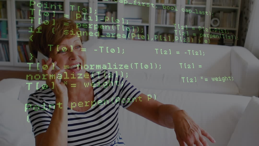 Senior woman sitting at home, talking on a smartphone, with digital coding overlay conveying technology and data processing. Useful for illustrating concepts related to senior technology use, communication advancements, or technology in home environments.