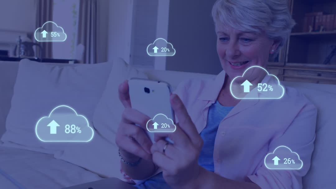 Elderly woman interacting with a smartphone with animations of cloud icons representing data upload percentages. This visual highlights the engagement of seniors with modern technology and cloud computing. Perfect for illustrating themes of connectivity, technology adoption across ages, data management, or digital lifestyle for older adults.