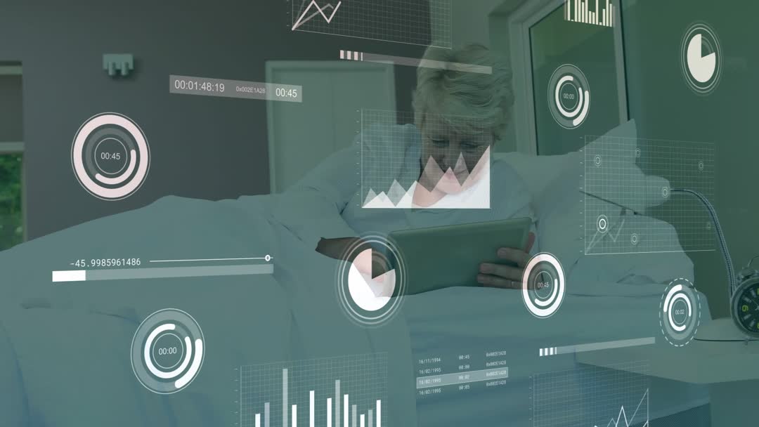 Senior woman is relaxing on bed with a tablet displaying floating financial data charts. Ideal for illustrating themes of technology usage among seniors, financial planning, modern lifestyle, and digital engagement. Useful for websites, ads, and articles focusing on tools and devices aiding in senior wellbeing and investment planning.