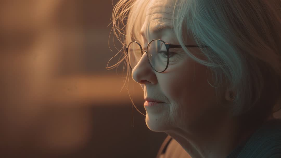 AI Generated Video. Close-up profile video showing senior woman gazing into warm lamp light, creating intimate reflective mood. Soft rim lighting and shallow depth of field producing creamy bokeh and warm skin tones. Subtle facial details such as wrinkles and spectacles adding authenticity and emotional depth. Ideal for elder care campaigns, retirement planning, healthcare and wellness features, memory and dementia awareness content, family storytelling, and lifestyle vignettes. Footage working well as background for voiceover, on-screen text, or slow cinematic cutaways. Suggested edits include applying warm color grade, adding soft vignette, using slow push-in or crossfade for emotional emphasis, and overlaying subtle ambient music. Horizontal 16:9 composition supporting full-screen video, web, and presentation use.