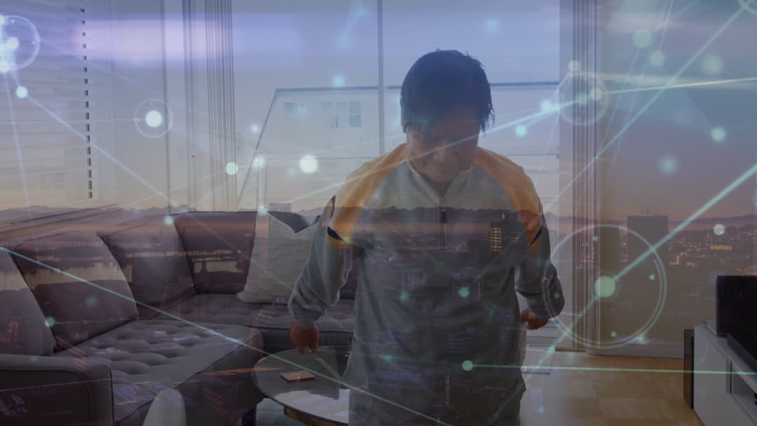 A senior woman with animated digital network lines overlay in a modern home environment, symbolizing connectivity and technology. Ideal for use in exploring themes of technology inclusivity, digital living solutions for seniors, or illustrating concepts of modernity combined with traditional living experiences.