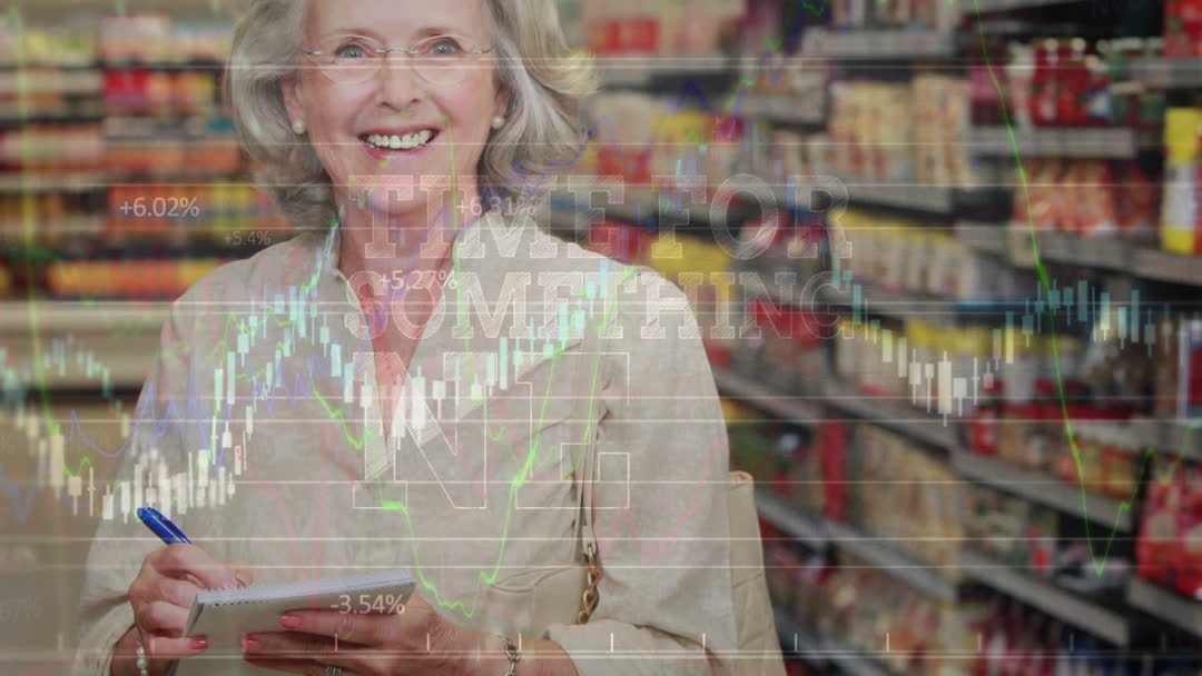 Happy senior woman holding pen and notepad in grocery store overlaid with financial data graphics. Visual represents the intersection of personal finance and shopping habits. Suitable for use in advertising, financial articles on budget management, or educational materials on financial literacy for seniors.