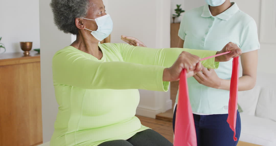 Senior woman using resistance bands under guidance of professional physiotherapist at home. Both women wear masks for safety, promoting safe exercise routines and elderly healthcare. Useful for articles on home physiotherapy, senior fitness, safeguarding health, or telehealth solutions.