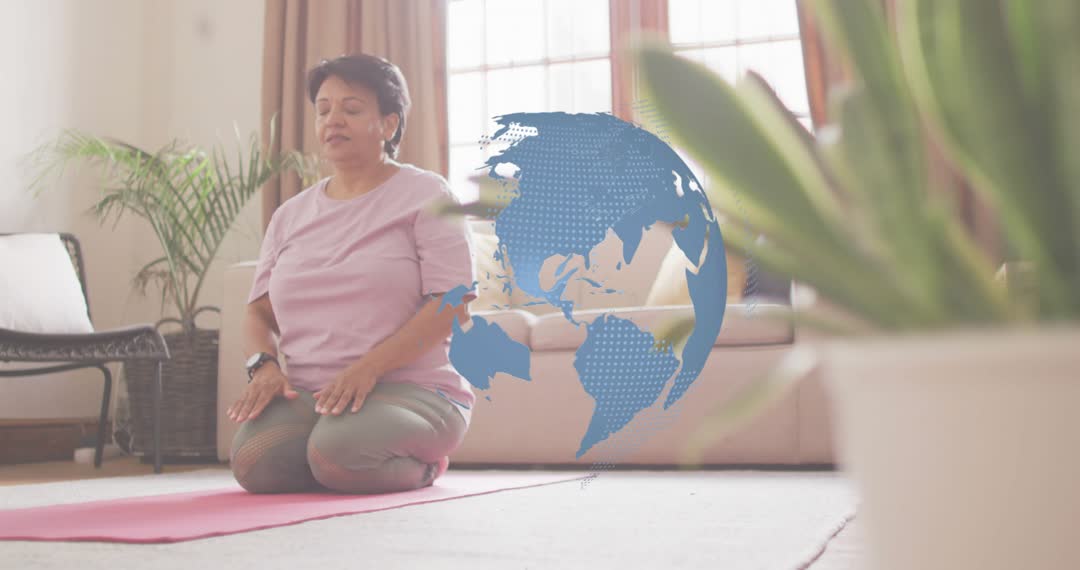 A senior woman is portrayed in a state of meditation while kneeling on a yoga mat, creating a serene and tranquil atmosphere. A rotating digital globe superimposed in the background symbolizes global wellness and holistic practice. This visual can effectively promote themes of mindfulness, wellness retreats, health publications, and global peace initiatives.