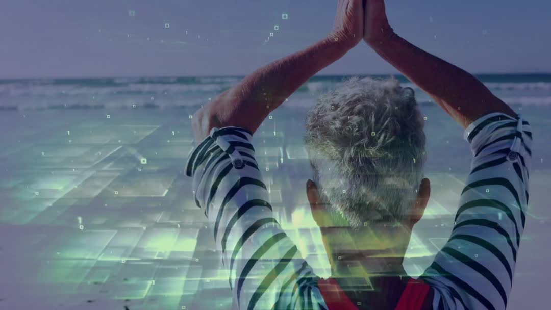 Depicts senior woman performing a prayer pose on a serene beach with digital effects enhancing the scene. Symbolizes harmonious blend of technology and nature, ideal for concepts of digital wellbeing, outdoor mindfulness, and promoting healthy, active lifestyles for mature audiences. Useful in campaigns for wellness retreats, beach resorts, or technology-driven meditation programs.