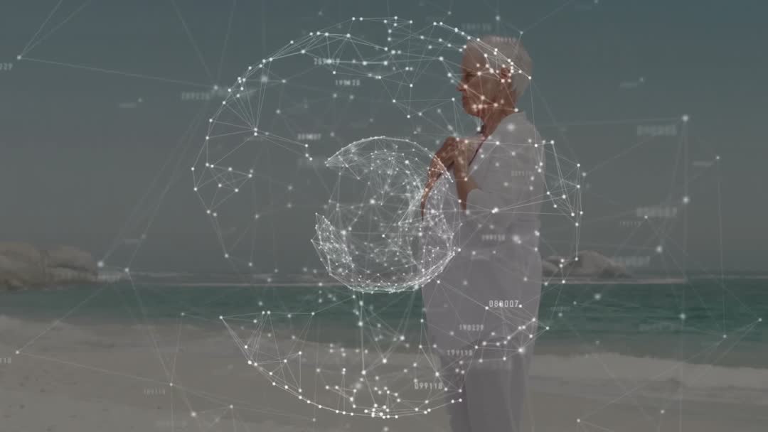 - Senior Woman Practicing Tai Chi with Digital Network Visualization on Beach