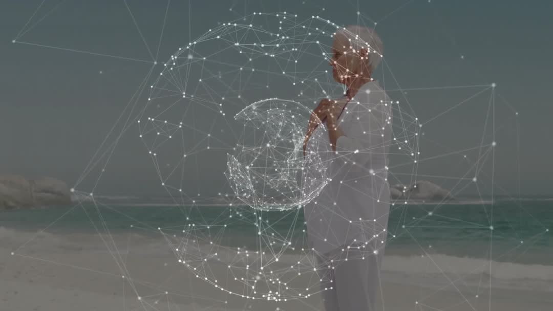 A senior woman gracefully practicing Tai Chi on a serene beach with an artistic digital sphere pinpointing around her poses a mood of wellness and vitality. This scene transcends harmony, serenity, and mindfulness. Perfect for wellness-related content, health websites, meditation workshops, mind-body harmony promotions, and dynamic digital themes.