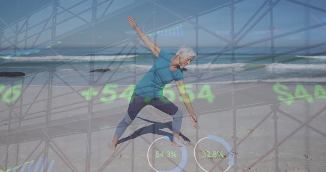 A senior woman enjoying a yoga session on the sandy beach, with abstract digital data and financial graphics overlay. This symbolizes a blend of personal wellbeing and technological advancement, illustrating the interconnectedness of health and modern business dynamics. Suitable for themes on healthy lifestyle for seniors, digital transformation in wellness sector, and financial resilience.