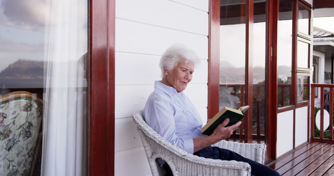 An elderly woman enjoys her afternoon reading in comfort on a balcony, promoting a peaceful and serene lifestyle. Ideal for articles or content focused on retirement living, slow-paced life enjoyment, book reviews, or elder care publicity.