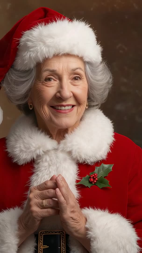 AI Generated Image. Vertical video showing senior woman smiling in Santa outfit, tilting head slightly while clasping hands for warm holiday greeting. Close-up portrait featuring white hair, fur-trimmed red coat, matching Santa hat and holly pin. Soft studio lighting accentuating natural wrinkles and joyful expression, conveying warmth and nostalgia. Suiting holiday ads, greeting videos, mobile story ads, eldercare seasonal campaigns, retail promotions and charity appeals. Editing suggestions: adding gentle snowfall overlay, warm color grade, festive music bed, and space for vertical text or logo. Delivering authentic senior representation for multichannel seasonal content and social media vertical formats.