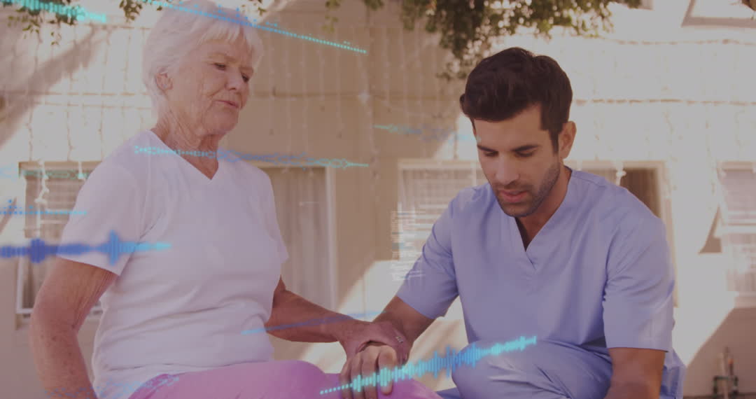 A senior woman is receiving care from a male physiotherapist outdoors. Animated digital data overlays suggest technological advancements in patient monitoring. Useful for illustrating modern healthcare services, highlighting the integration of technology in medicine, and demonstrating elderly care routines.