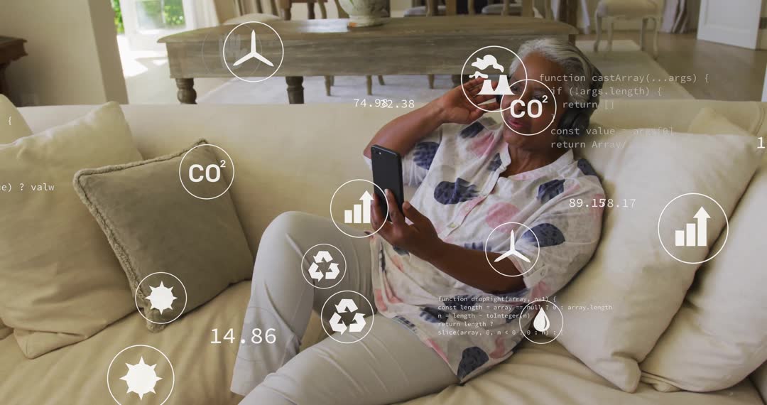 A senior woman sits comfortably on a sofa with her hand on her headphones, interacting with her smartphone. Surrounding her, numerous digital eco icons appear, signifying advanced environmental monitoring and a tech-savvy lifestyle focused on wellness and sustainability. This video represents the merging of modern digital technology with everyday life to ensure wellness and smart organic living. Ideal for use in media related to lifestyle technology for seniors, sustainable living tutorials, environmental awareness campaigns, or health and wellness tech innovations.