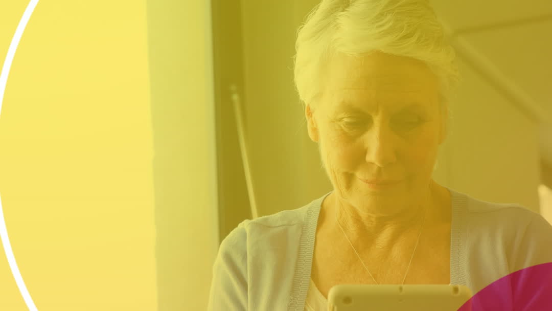 Senior Woman Using Tablet with Colorful Abstract Overlay Video