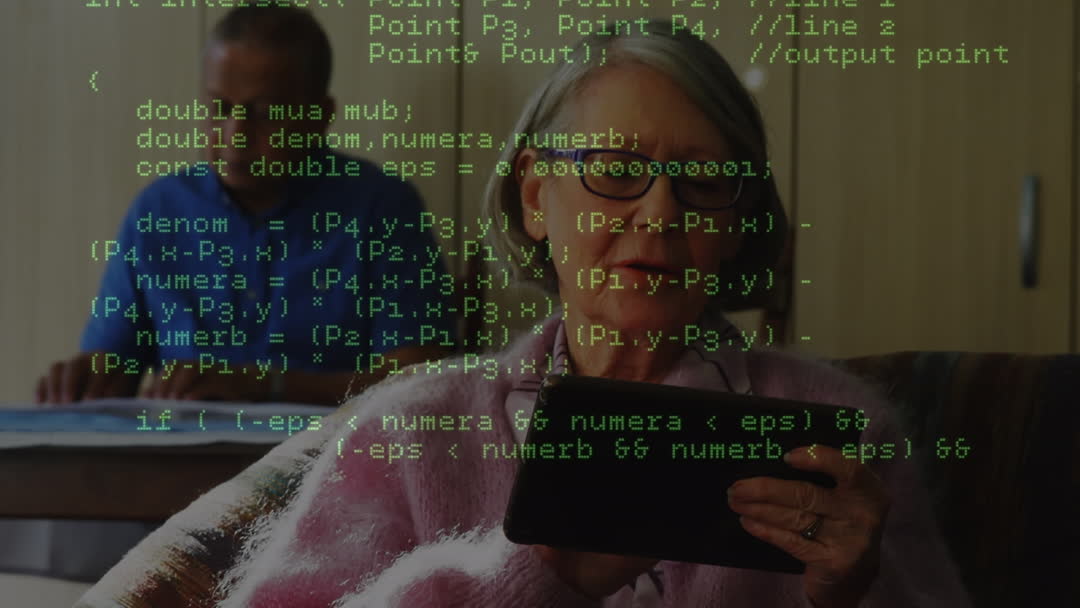 Elderly woman engages with a digital tablet, enhanced by an overlay of programming code reflecting data processing. Highlights intersection of seniors with modern technology and innovation in user-friendly digital tools. Suitable for themes on digital literacy, tech innovation for the elderly, and promoting technology in everyday life.