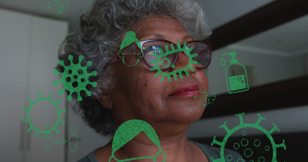 Senior African American woman is being overlaid with pandemic-related icons such as virus symbols and protective equipment. This representation highlights concerns regarding COVID-19 and emphasizes the importance of safety measures for seniors. Suitable for use in giving visual context to healthcare topics, awareness campaigns on pandemic protection, or informing about challenges faced by older adults during the COVID-19 pandemic.