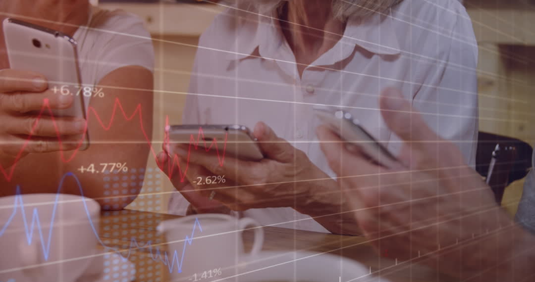 Senior women are using smartphones while digital graphs overlay screens, depicting engagement in data analysis or investment activities. Can be used for topics related to technology adoption by older generations, business communication, or data-driven decision making.