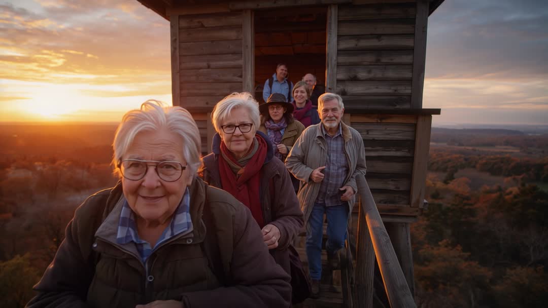 AI Generated Image. Showing group of seniors descending wooden lookout tower stairs at golden hour, walking away from cabin into sweeping autumn landscape. Featuring smiling men and women wearing jackets and scarves, holding railing while stepping down, creating sense of companionship, safety, and shared adventure. Conveying warm sunset light, golden tones, and cinematic atmosphere for emotional storytelling. Serving travel agencies, retirement community marketing, senior wellness programs, outdoor tour operators, lifestyle blogs, and social media campaigns. Working well as B-roll or establishing shot for video projects, hero banner for website, background for brochure or presentation, and promotional clip for active aging and community events. Highlighting themes of friendship, healthy aging, nature exploration, adventure travel, and intergenerational connection.