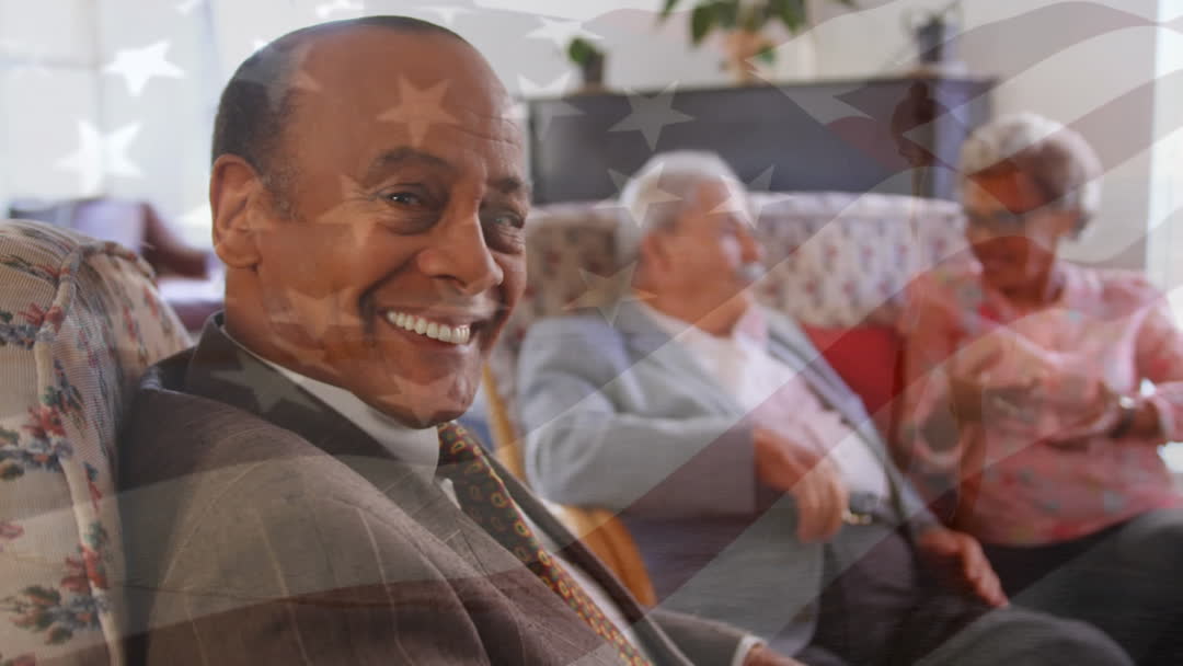 Seniors Gather with USA Flag Overlay Reflecting Community Video