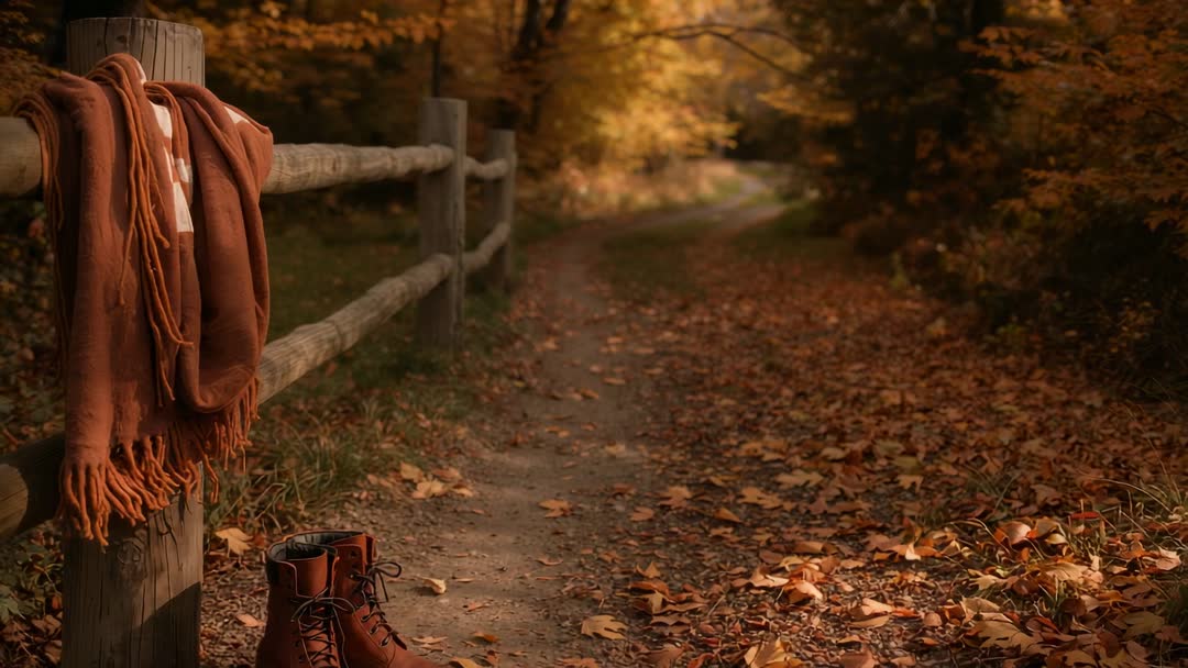 - Serene Autumn Path Ending With Boots and Scarf on Fence