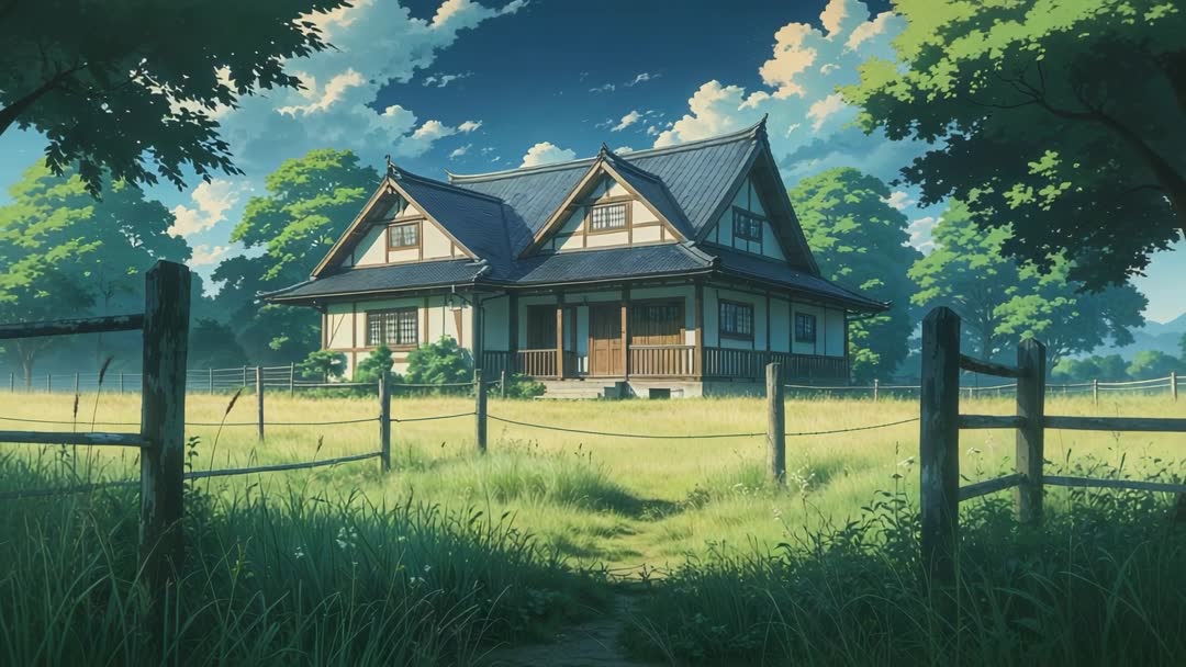 AI Generated Image. This visualization captures a traditional wooden farmhouse set in a serene countryside. Gentle sunlight dapples the grassy field while the trees sway with the breeze, under a sky speckled with drifting clouds. The scene exudes tranquility and pastoral beauty, ideal for illustrating themes of nature, rural life, and simplicity. Suitable for use in calming backgrounds, rustic design themes, or animation contexts, especially for studio-produced leaves, landscape-focused projects, or environmental design inspiration.