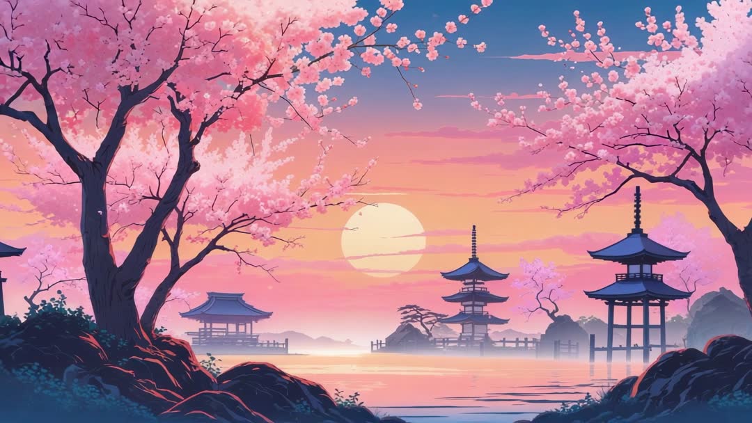 - Serene Dusk Landscape with Pagodas and Cherry Blossoms