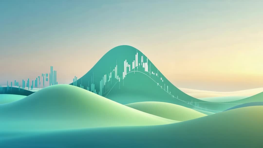 AI Generated Video. Gentle pastel hills blend seamlessly with animated candlestick charts, early morning sky imparting tranquil warmth to the technology-rich scene. Visual melds richness of digital data with the organic flow of natural landscapes, evoking growth and potential in finance. Useful for innovative investment concepts, financial services marketing, or technology-integration themes, offering harmonious aesthetic merging financial metrics and serene backgrounds.