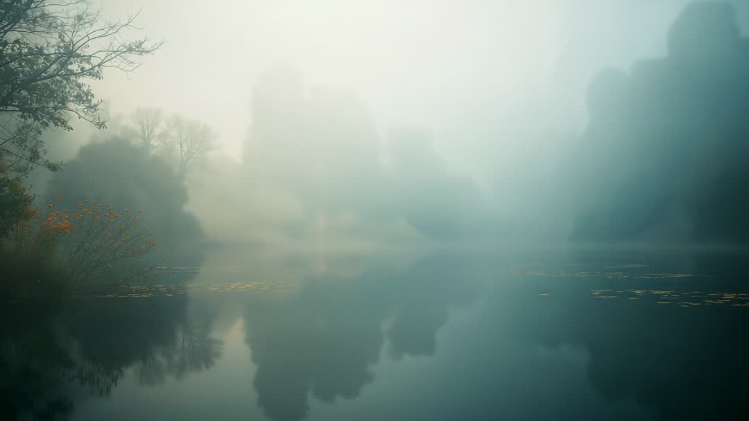 AI Generated Image. Video depicting gentle fog drifting across a calm lake, highlighting silhouetted trees and autumn leaves. Lily pads float quietly on the surface, enhancing the tranquil and serene atmosphere, perfect for conveying the essence of calmness, meditation, or relaxation scenes, ideal for use in nature documentaries, relaxation videos, or digital artwork inspirations.