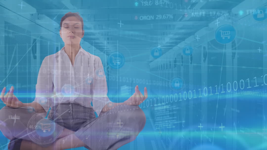 A woman sitting in a meditative pose in a server room symbolizes the balance between technology and mindfulness. Ethereal binary codes and digital graphics overlay the atmosphere, inviting a connection with both the virtual and the inner world. This visual is ideal for illustrating concepts around digital detox, mental wellness in tech environments, and balancing technology with human experience.