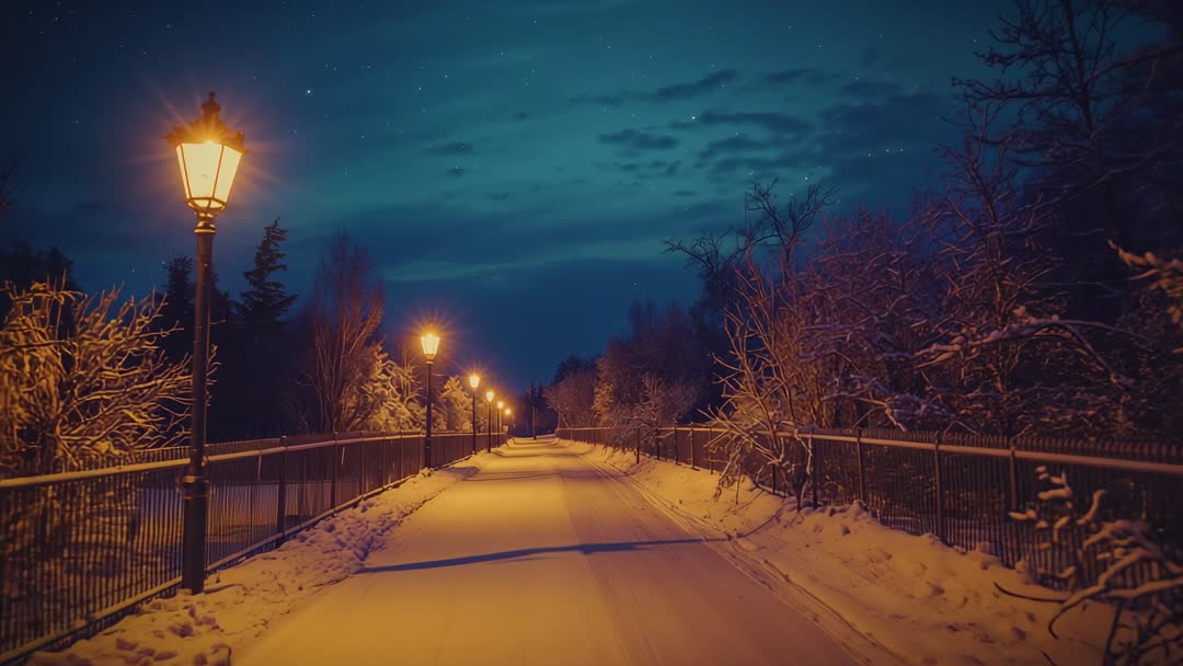AI Generated Image. Video starts with a peaceful nighttime view of a snowy path flanked by lampposts casting a gentle glow. Sky dotted with stars adds a touch of natural beauty. Ideal for themes of serenity, winter landscapes, or discussions on nighttime atmospheres. Could be used in relaxation or ambient video projects, focusing on tranquility and seasonal beauty.