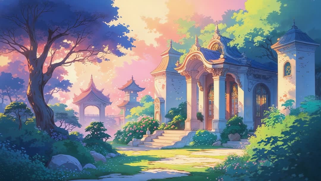 AI Generated Image. The video captures sunlight streaming through dense trees, illuminating classical architectural details of a pavilion with surrounding blooming flora. The tranquil garden ambiance is enhanced by the presence of traditional pagodas peeking through the morning mist. This scene embodies peaceful serenity, making it suitable for designs aiming to evoke calmness and classical architecture appreciation. Ideal for storytelling about historical parks or nature-inspired calm content creation.