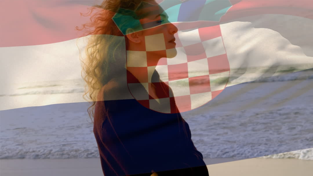 Woman stands calmly at beach under picturesque sunset, Croatian flag overlaid in translucent colors symbolizing strong national pride. Perfect for content related to travel in Croatia, patriotism, national holidays, or ads highlighting personal introspection and cultural connection.