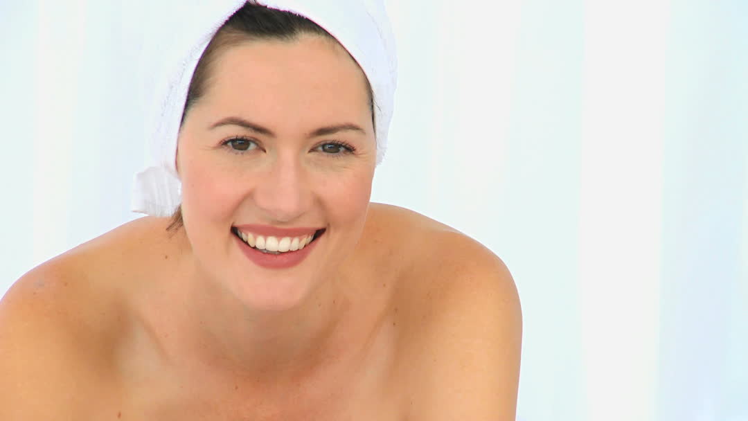 A brunette woman with a towel wrapped on her head is smiling warmly. This video conveys relaxation and enjoyment, making it ideal for advertisements or articles related to spa treatments, beauty routines, or wellness tips.