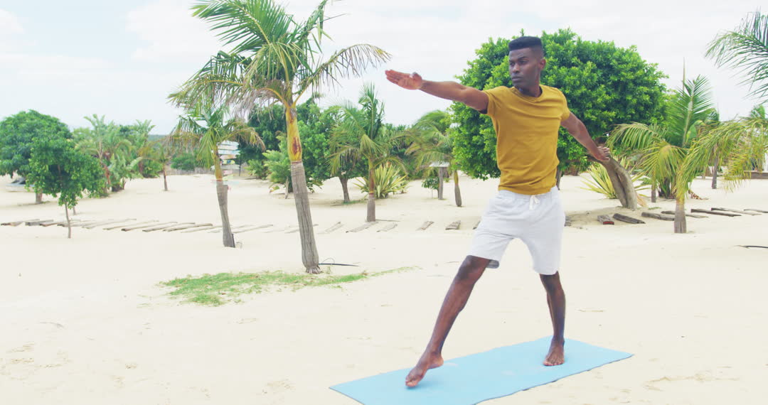 An African American man engaging in outdoor yoga on a beautiful, sunlit beach, showcasing balance and mindfulness. Ideal for promoting wellness retreats, healthy lifestyle endeavors, summer vacation packages, and fitness-related content. The tranquil setting accentuates the connection with nature, highlighting themes of relaxation and wellness.