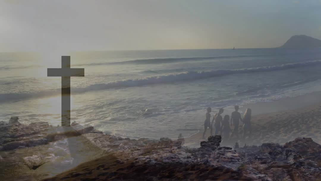 Video portrays peaceful beach with cross overlay symbolizing spirituality and unity among friends walking into ocean, enhancing themes of health and enlightenment. Ideal for projects on friendship, spiritual journeys, and nature retreats.