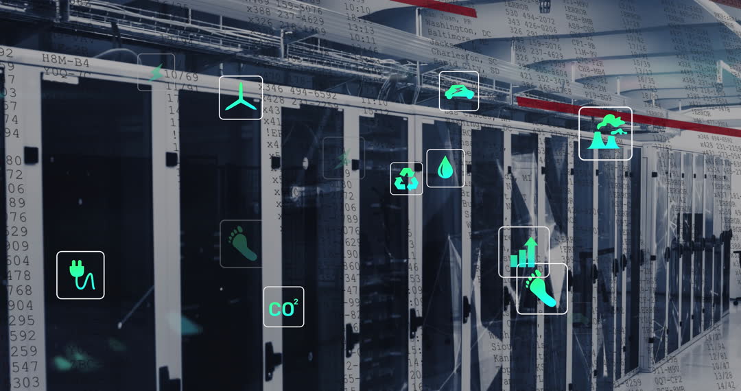 Rows of servers overlaid with animated icons symbolize the intersection of technological advancement and environmental awareness. Icons include symbols of renewable energy, water conservation, and carbon reduction. Perfect for illustrating concepts of sustainable technology, eco-friendly data solutions, and digital transformation within businesses focusing on environmental impacts and IT management.