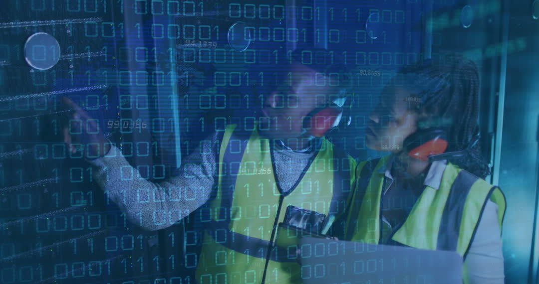 Server room technicians in high vis vests and headphones decoding binary data projected on glass. Ideal for illustrating concepts of cloud computing, data security, or IT work environment. Suitable for technology and business resources.