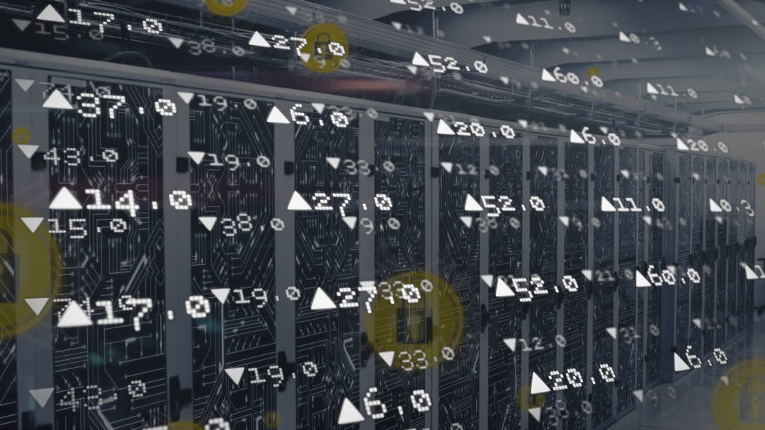 Visual depicts modern server room with overlay of animated data processing icons and binary code, representing technology, computing, and secure data analysis. Useful for tech articles, illustrating concepts in big data, AI, cybersecurity, and information technology evolution.