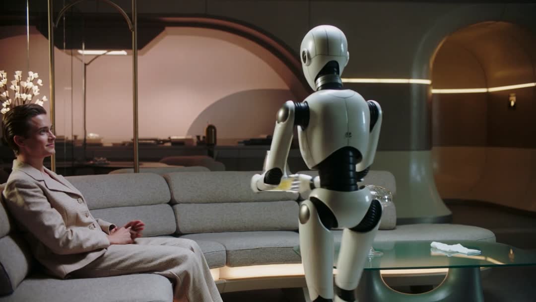 AI Generated Image. Clip showing humanoid service robot handing glass to beige-suited man seated on modern gray sofa in sleek futuristic lounge. Scene highlighting human-robot interaction, precise robotic movement, ergonomic design, and warm ambient lighting. Useful for illustrating robotics in hospitality, demonstrating AI automation in customer service, supporting content about future workplace, corporate innovation, luxury technology, or smart interiors. Suitable for promotional videos, corporate presentations, website hero banners, social media ads, training materials, and editorial use focusing on automation and human-machine collaboration.