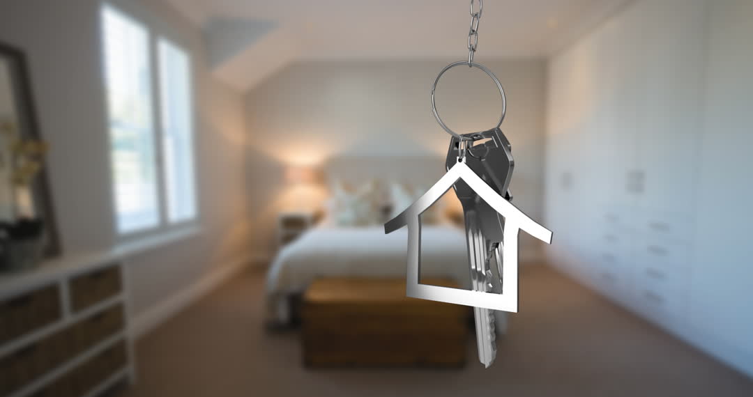 A set of metal keys dangled from a keychain modeled in the silhouette of a house. The keys are in focus against the backdrop of an elegantly furnished bedroom. This represents themes of homeownership, the excitement of moving into a new house, or real estate transactions. Ideal for use in marketing materials for real estate agents, housing developers, or to symbolize securing one's personal space.